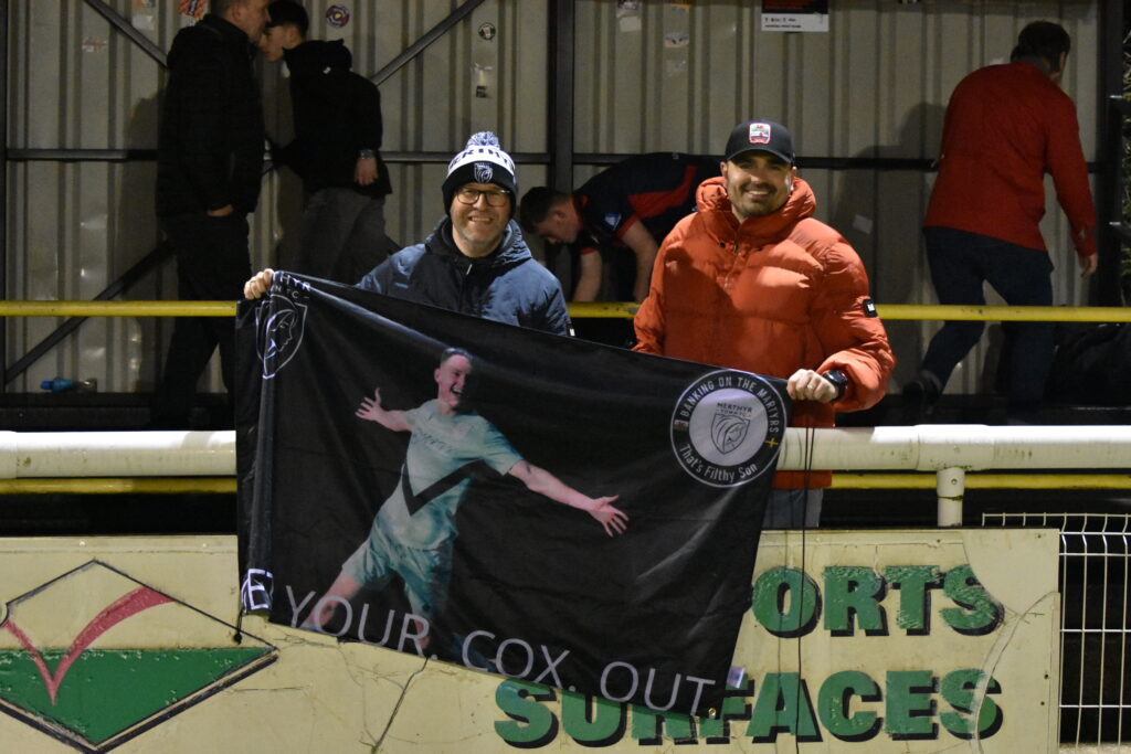 The cut up pitch was causing issues for Merthyr and their usual brand of slick passing was being banished at times as they had to resort to balls over the top. It was one of these balls that broke the deadlock on 17 minutes, as Rai won the ball back before lofting a ball over the head of Glennon which Cox was on like a flash. Brearey rushed out from his line but Cox was able to reach the ball first, knocking it past him on the left before being taken out on the edge of the box. A clear penalty and a yellow for Brearey’s troubles.